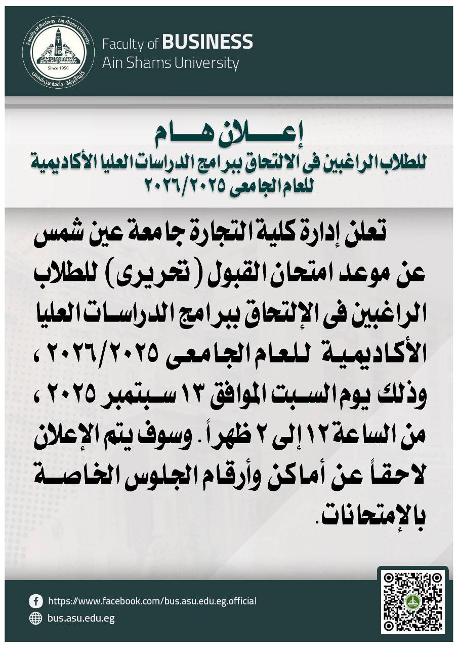 اعلان هام للطلاب الراغبين فى الالتحاق ببرامج الدراسات العليا الاكاديمية 2025-2026