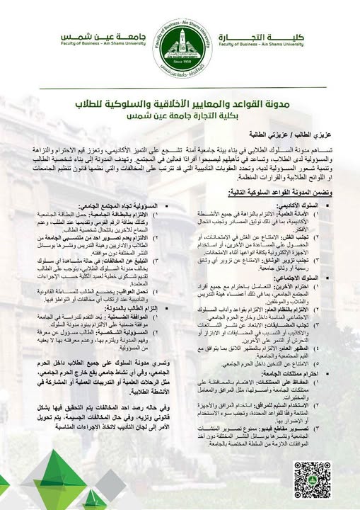 أطلقت كلية التجارة بجامعة عين شمس مدونة القواعد والمعايير الأخلاقية والسلوكية للطلاب، وذلك في إطار بناء بيئة جامعية آمنة تشجع على التميز الأكاديمي، وتعزز قيم الاحترام والنزاهة والمسؤولية لدى الطلاب، وتساعد في تأهيلهم ليصبحوا أفرادا فعالين في المجتمع.