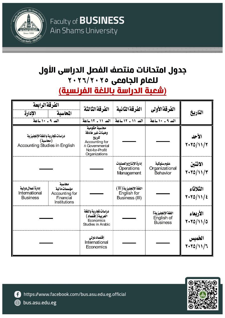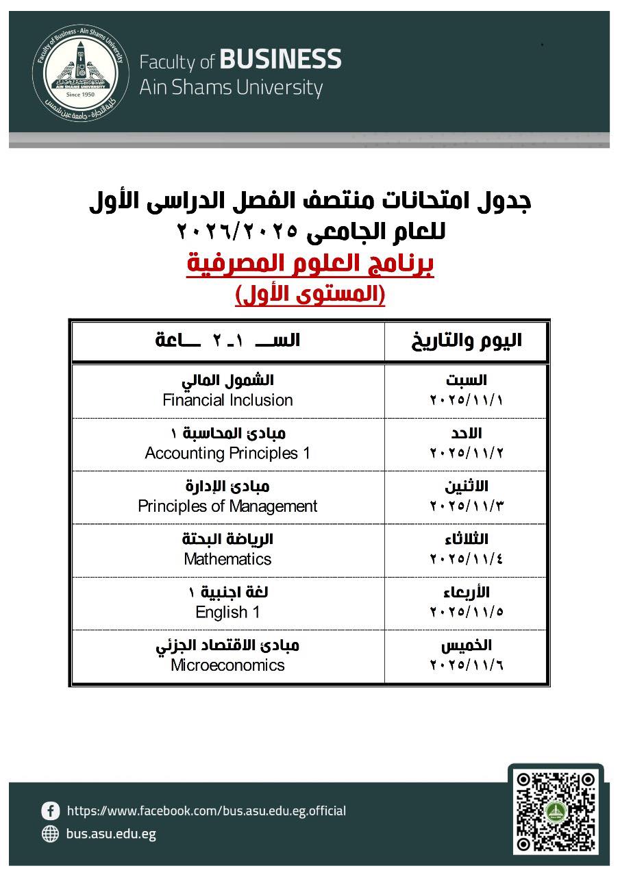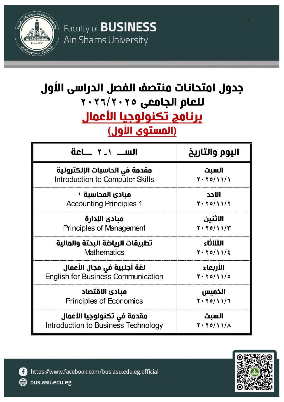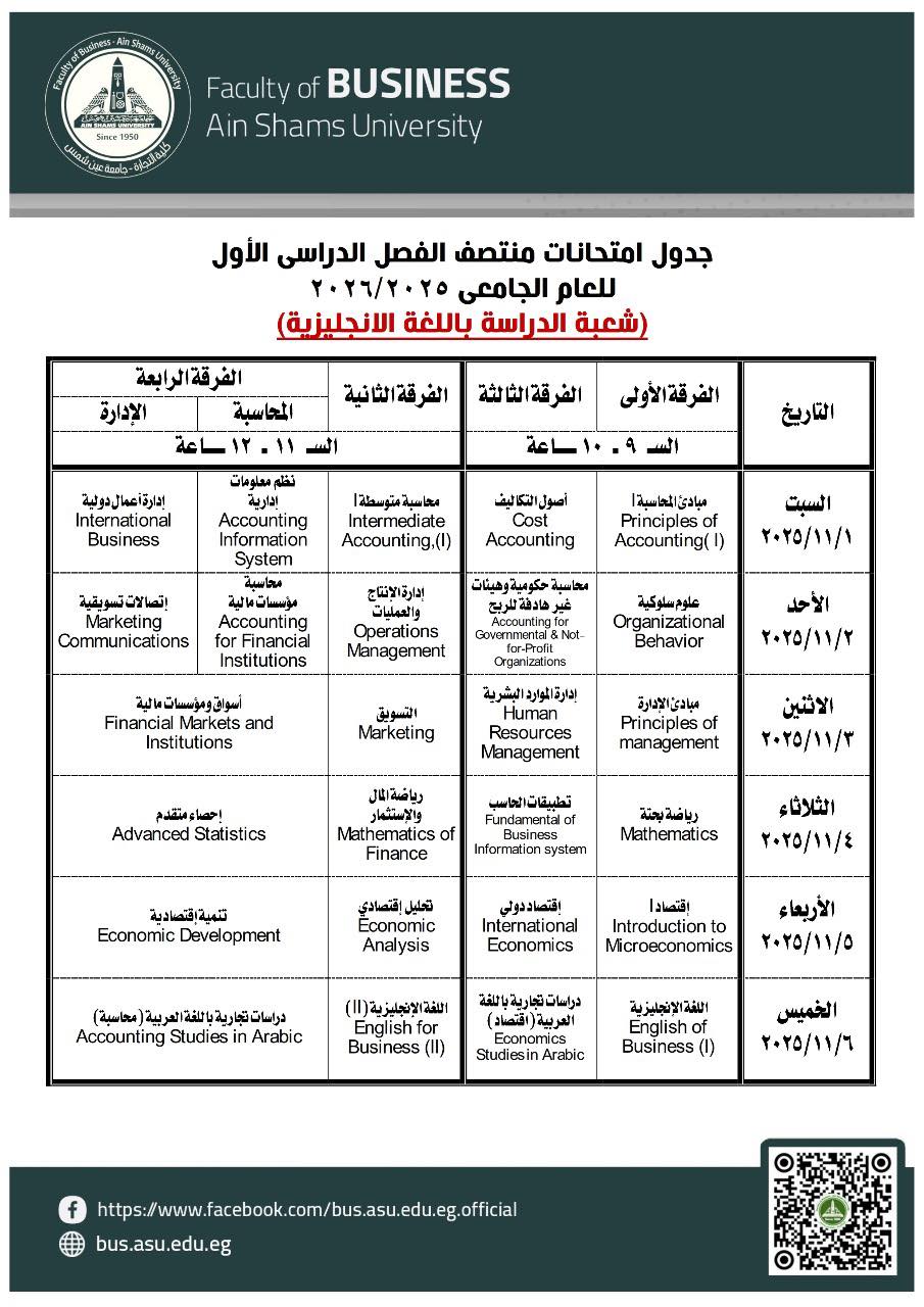 جدول امتحانات منتصف الفصل الدراسى الاول - العام الاكاديمي ٢٠٢٥- ٢٠٢٦