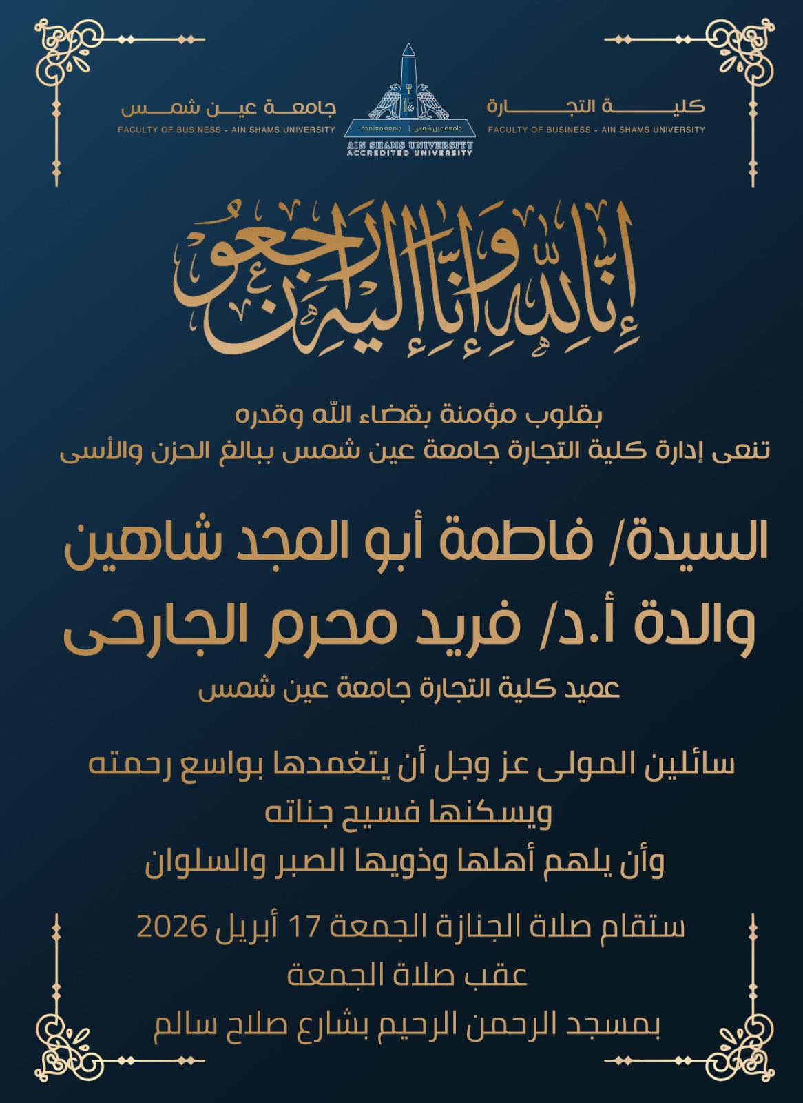 تنعى إدارة الكلية ببالغ الحزن والأسي والدة أ.د فريد محرم
