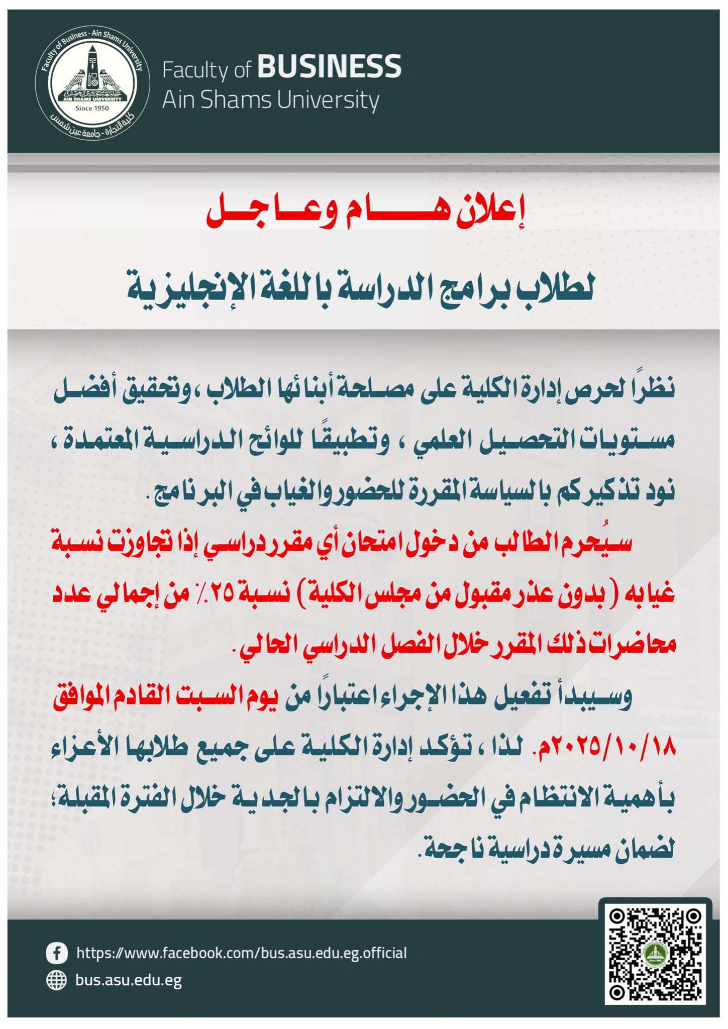 اعلان هام وعاجل | لطلاب الفرقة الأولي في برامج الدراسة باللغة الإنجليزية