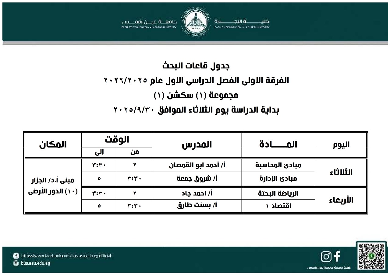 إعلان هام كشوف وجدول قاعات البحث لطلاب الفرقة الأولى