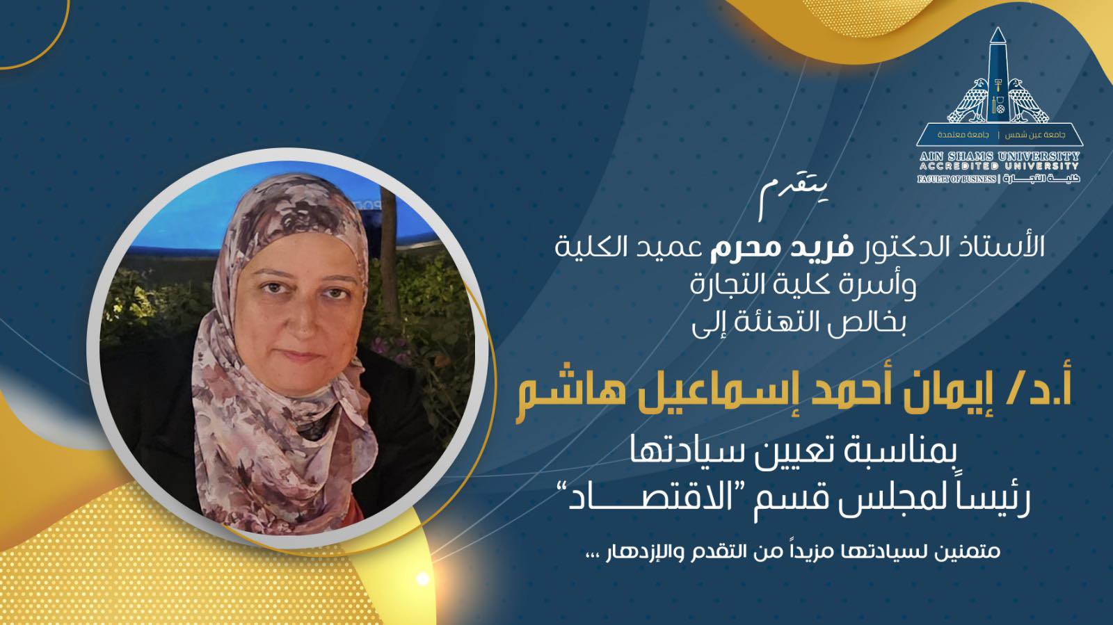 يتقدّم الأستاذ الدكتور فريد محرم الجارحي، عميد كلية التجارة بجامعة عين شمس، والسادة الوكلاء وأعضاء هيئة التدريس والهيئة المعاونة والسادة الإداريين، بأصدق التهاني وأطيب التمنيات للأستاذة الدكتورة إيمان أحمد إسماعيل هاشم، وذلك بمناسبة صدور قرار السيد الأستاذ الدكتور رئيس الجامعة بتعيين سيادتها رئيساً لمجلس قسم الاقتصاد بالكلية لمدة عام.