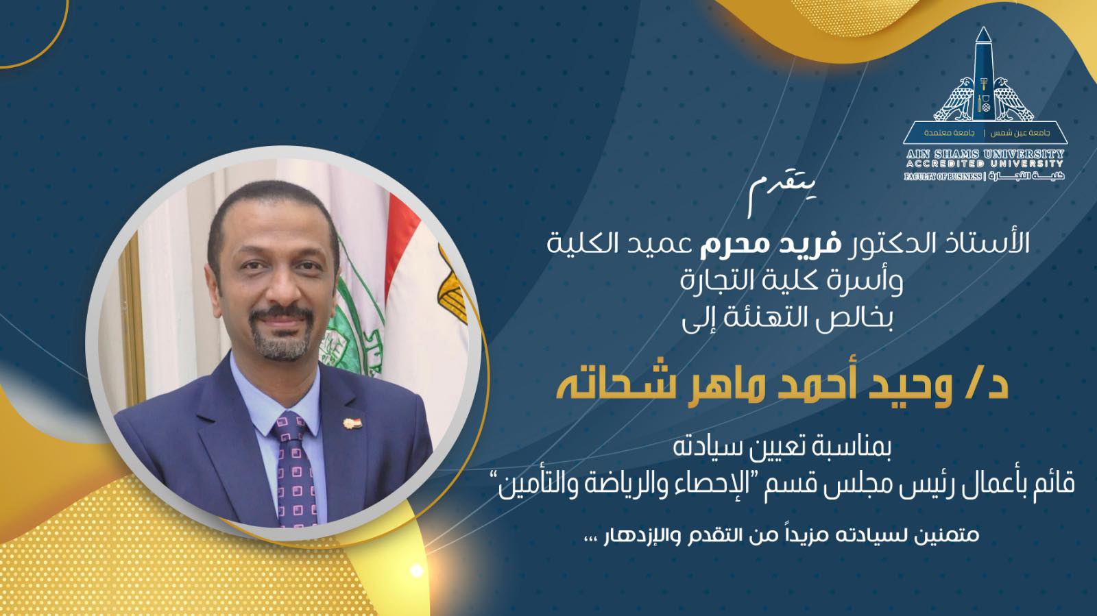 يتقدّم الأستاذ الدكتور فريد محرم الجارحي، عميد كلية التجارة بجامعة عين شمس، والسادة الوكلاء وأعضاء هيئة التدريس والهيئة المعاونة والسادة الإداريين، بأصدق التهاني وأطيب التمنيات للأستاذ الدكتور وحيد أحمد ماهر شحاتة، وذلك بمناسبة صدور قرار السيد الأستاذ الدكتور رئيس الجامعة بتعيين سيادته رئيساً لمجلس قسم الإحصاء والرياضة والتأمين بالكلية لمدة عام.